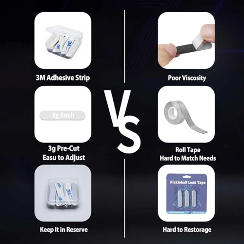 Specifications – 30 pcs Lead Tape,1pc box. 3 grams for each pickleball lead tape, 5*1cm in area. 3M Adhesive Back Strips – Our Lead tape made with 3M backing strips, 3x more excellent stickiness than other golf lead tape, make solid bond with paddle and racket.