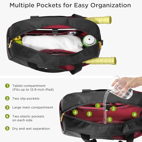 【Large Storage Capacity】 With its large tote design, our pickleball bag provides ample space to carry all your essential gear. It features a front pocket specifically designed to hold 2-4 pickleball paddles, while inner storage pockets allow for convenient organization of accessories,Two exterior side pockets can hold an umbrella or water bottle, and Tablet compartment fits up to 12.9″ iPad.