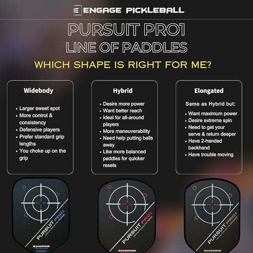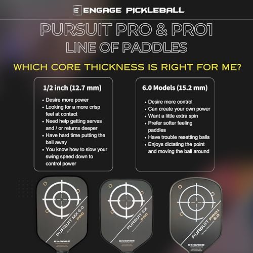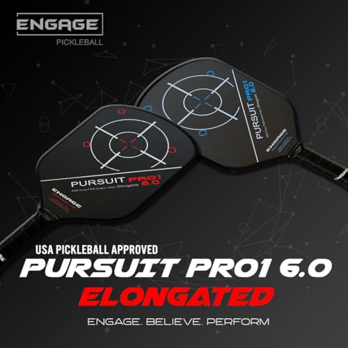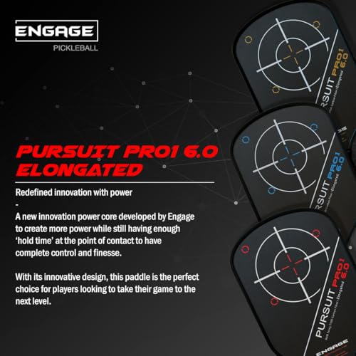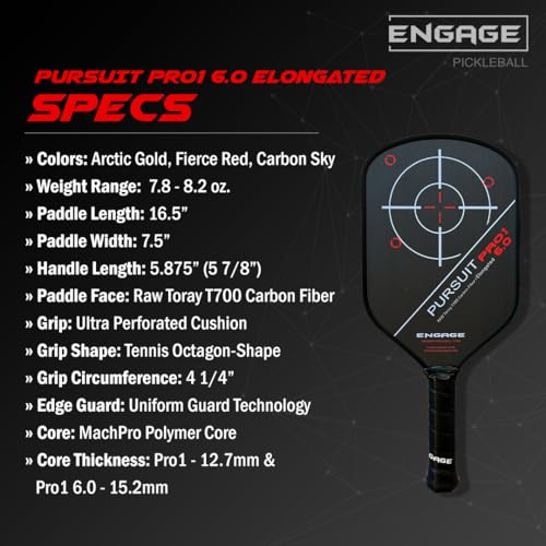 Engage Pursuit Pro1 6.0 Elongated Carbon Fiber Pickleball Paddle, Designed not to replace the ever-popular Pursuit Pro, but rather provide an option for players who find themselves searching for advancement, the Engage Pursuit Pro1 6.0 Elongated Pickleball Paddle brings a slightly changed shape and more to the Pursuit line. The new shape found in the Pro1 line focuses on maximizing swing speed and hand speed through aerodynamics so that you can achieve spin, power, and reach without giving up the control provided by the 16mm MachPro Core. This proprietary core works to provide the dwell time you need for a controllable soft feel and plenty of spin, without limiting rebound that leads to poppy power. Speaking of power, unique to the Pro1 is Variable Release 2.0 technology that offers more flex, meaning the faster you swing this paddle, the more it flexes and snaps into the ball for unparalleled put aways.While the new technology found in the 16.5” Pursuit Pro1 6.0 Elongated Paddle from Engage certainly caught our attention, we were excited to see the return of the Raw Toray T700 Carbin Fiber hitting surface. Measuring in at 7.5” wide, this hitting surface boasts a natural texture that grips the ball as it lingers for dominant spin potential. Also back is the close-to-the-hand counterbalance technology, vibration-eating uniform guard technology, and the stability of foam reinforcement thanks to the Vortex Barrier Edge.