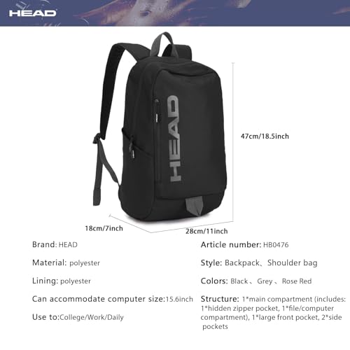 ⭐【Perfect Sport Gym Backpack】: Size: 28*18*47cm/11*7*18.5; HEAD Backpack structure: 1*main compartment (includes: 1*hidden zipper pocket, 1*file/computer compartment), 1*large front pocket, 2*side pockets. The thick foam design on the back of this college backpack is soft and comfortable, offering exceptional support for a sports backpack ,which can reduce the stress on the back when carrying a travel backpack for a long time, making you more relaxed in any situation.