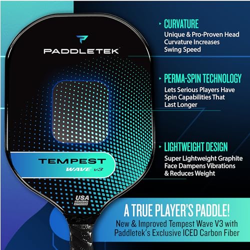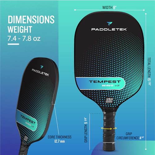 ULTRA-CUSHION HIGH-TACK PERFORMANCE GRIP: The Paddletek Tempest Wave V3 pickle ball paddles feature an ultra-cushion high-tack performance grip that provides superior control and comfort during long games. It also helps absorb vibration for a more comfortable feel on each shot.