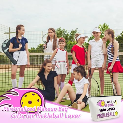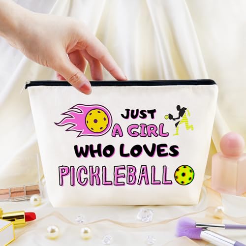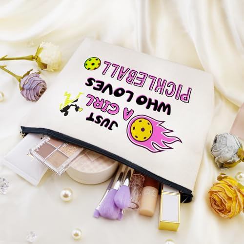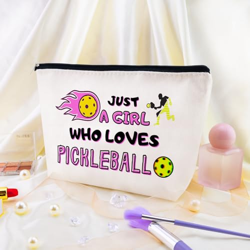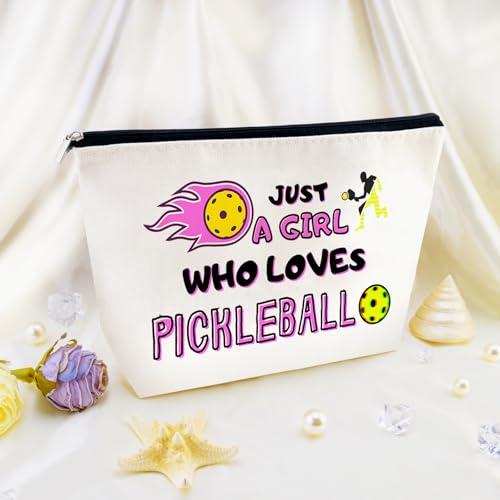 Pickleball Themed Gifts for Women: Featuring the phrase “Just a …. Who Loves Pickleball” with an illustration of a player hitting a pickleball, this cosmetic bag adds a touch of personality and style to your accessories, perfect for pickball lovers and athletes