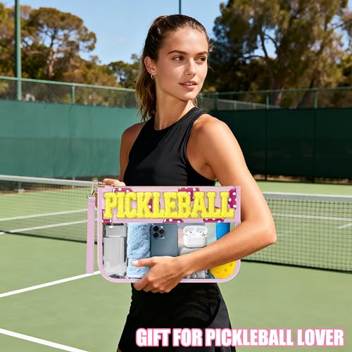 STYLISH DESIGN: Clear PVC pickleball makeup bag featuring varsity-style chenille letter patches, perfect for pickleball enthusiasts with a preppy aesthetic appeal