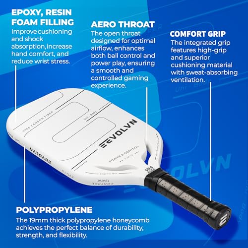 Step onto the court with confidence with the EEVOLVN EVO 1.0. Designed for balanced-to-intermediate players craving the perfect blend of power and precision, this paddle features an advanced T700 carbon fiber face with a dual-tone matte finish in black and white. That sophisticated palette underscores your serious style and commitment to precision, while the carbon-grit textured coating amplifies spin and razor-sharp shot placement. Its 19 mm polypropylene honeycomb core delivers explosive pop and rock-solid stability—so you can drive baseline winners and finesse dinks with equal ease. An open Aero throat channels airflow to slash drag on every swing, while the precision-balanced edgeless frame expands your sweet spot and trims weight for fatigue-free rallies. Beneath the high-traction surface, an epoxy resin foam filling cushions impacts and dampens vibration to reduce wrist stress through long matches. The integrated Comfort Grip locks in moisture with breathable cushioning, ensuring a secure, slip-free hold from first serve to match point. Tested in daily pick-up games, weekend rallies, and regular practice sessions, the EVO 1.0 consistently outperforms the competition in pop, control, and lasting durability—delivering reliable performance every time you play. Elevate your everyday game with the EEVOLVN EVO 1.0, a paddle engineered to work as hard as you do and empower you to master every rally.