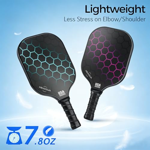 BEGINNER-FRIENDLY: Design for beginners, our 8oz pickleball paddle features 13mm polymer honeycomb, providing the perfect balance of speed and power. With a fiberglass surface and durable edge shield, it offers excellent buffering and elasticity, ensuring a smooth, controlled feel for the play.