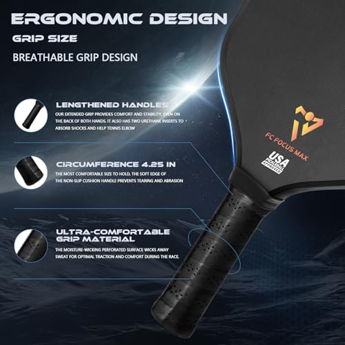 【Widebody Pickleball Paddles】 FC FOCUS MAX is Oversized Pickleball Paddles. Wideer racket for more power, the wider racket is perfect for players who play two-handed backhand drives, improving balance and providing extra leverage for a more powerful swing.