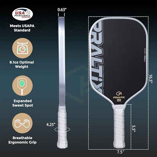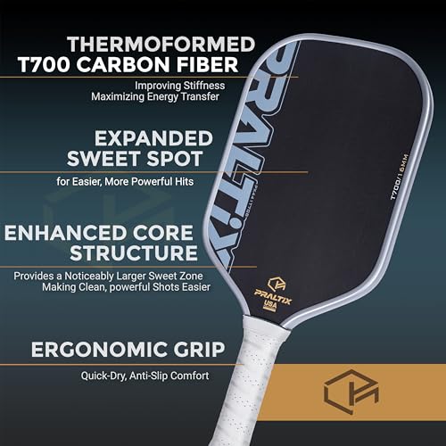 The Praltix T700 Carbon Fiber Pickleball Paddle combines professional-grade performance with exceptional durability. Featuring a USAPA-Standard design with T700 carbon fiber face and thermoformed polypropylene core, this paddle delivers superior power, control, and spin. The 5.5-inch grip provides comfortable handling for extended play, while the lightweight 7.9-8.2 oz construction ensures quick maneuverability. Perfect for intermediate to advanced players seeking tournament-quality performance with a 6-month warranty for peace of mind.