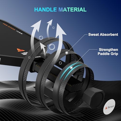 Ergonomic Sweat-Absorbent Carbon Grip: Features a 4.25″ ideal circumference with a non-slip, sweat-absorbing design that locks in a secure hold even during intense, sweaty rallies. The elongated handle supports two-handed backhands for enhanced leverage, while the ergonomic shape reduces hand fatigue during long matches.