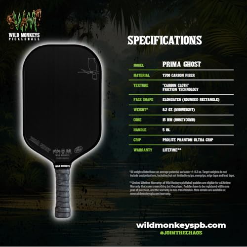 The Prima Ghost, built on the 15mm core and elongated face of the bestselling Prima 3K, boasts a raw T700 carbon fiber face enhanced with ‘carbon cloth’ friction technology for superior spin potential. It features the PROLITE Phantom Grip, offering a more subtle color profile and enhanced cushion and tackiness compared to its diamond counterpart. The Ghost Series, hand-wrapped with the PROLITE Phantom Ultra Grip, ensures ultimate tackiness, comfort, and moisture control, even in hot conditions. The series is designed for maximum spin and durability, with a T700 carbon fiber face and ‘carbon cloth’ friction technology, devoid of Wild Monkeys’ signature UV printed graphics. Silk-printed lines showcase the silhouette of the great horned owl, symbolizing elite stealth.